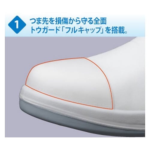 靴底から静電気を逃がし、スパークの発生を防止します。低姿勢での作業や設備の凹凸との接触など、床面や物とぶつけて破損しやすかったつま先をウレタン製の全面トウガード「フルキャップ」でカバーしました。 |