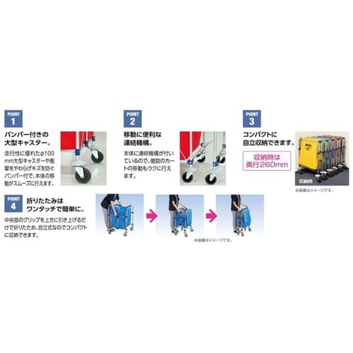 マジックテープ着脱式リサイクルカート。扱いやすく、袋の取り付けも簡単です。(袋は別売)走行性に優れたΦ100mm大型キャスターや衝撃をやわらげキズを防ぐバンパー付で、本体の移動がズムーズに行えます。 |
