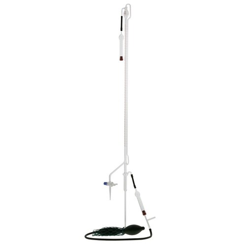 自動ビュレットは、ビュレットに比べ薬液の補充が2連球ゴムスプレーの操作で安全かつ正確に行えます。ゼロ(目盛)が自動的に調整できる構造となっており、ビュレットのゼロ合わせのコック操作の必要がありません。 |