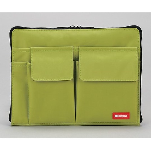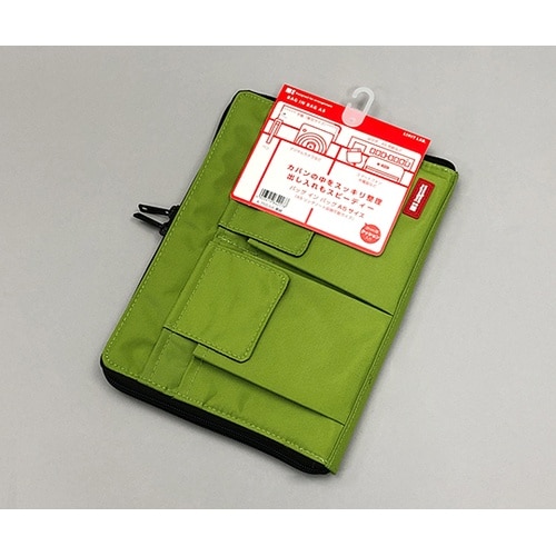 カバンの中でかさ張らない薄型タイプです。マチ付きポケットは落下防止用のフタ付きで、使用しない時はポケット内に収納できます。 |