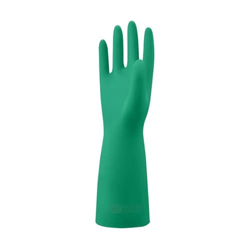 JIS T 8116に準拠した化学防護手袋です。油・酸性・アルカリ性の薬品の透過を防ぎ、経皮吸収のリスクから作業者を保護します。指と手のひら部分にスベリ止め加工を施しています。