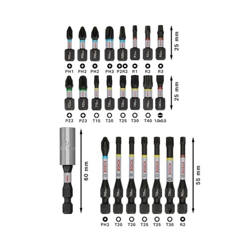 24ピース入りドライバービットセット。六角軸6.35mm 9mm溝シャンク。 |