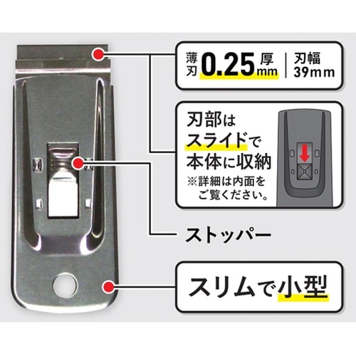 ステッカー、キッチンコンロのこげ落としに適しています。鋭い切れ味!0.25mm厚の薄刃です。刃部はスライドで本体に収納できます。 |