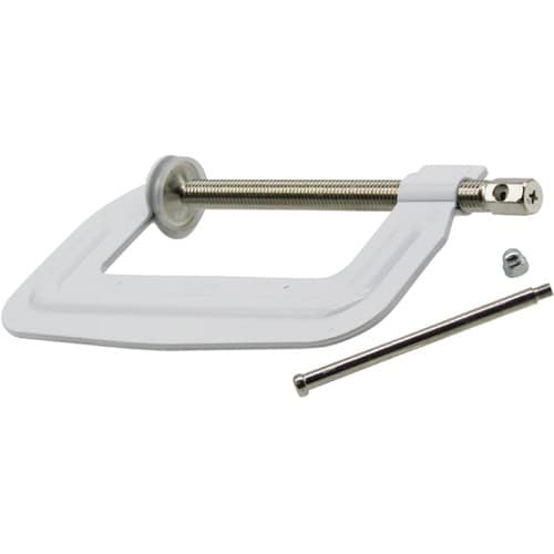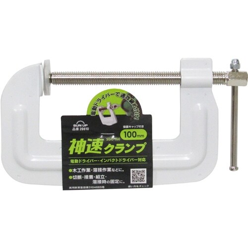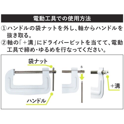 鋼製クランプ(Cクランプ)のハンドルの軸の基部に「+溝」が付いたクランプです。電動ドライバー・インパクトドライバー・充電ドライバーなどで締め・ゆるめが可能です。 |