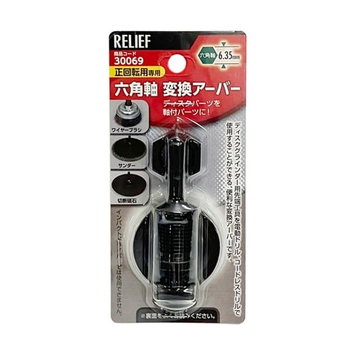 ディスクグラインダー用先端工具を電動ドリル、充電式ドリルで使用する際にご利用いただく6.35mm六角軸の変換アーバーです。 |