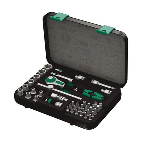 8100 SA 4シリーズ。頑丈な金属ケースに入った41個のZyklopセット。1/4インチドライブのZyklopラチェット。72 歯の細かい歯により、5° の低い戻り角が可能です。 |