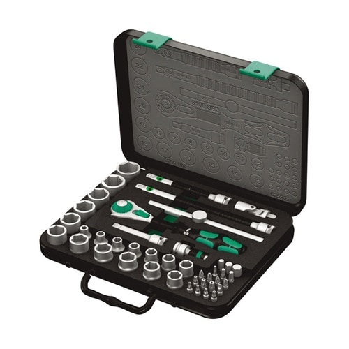 8100 SB 2シリーズ。頑丈な金属ケースに入った43ピースのZyklopセット。3/8インチドライブのZyklopラチェット。72歯の細かい歯により、5°の低い戻り角が可能です。 |