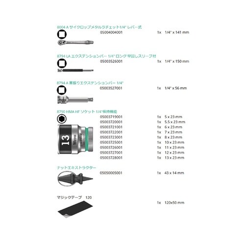 8100 SA 12 HF サイクロップメタルラチェット1/4” レバー式セット、1/4” drive、ミリ、保持機能付き13点セット。 |