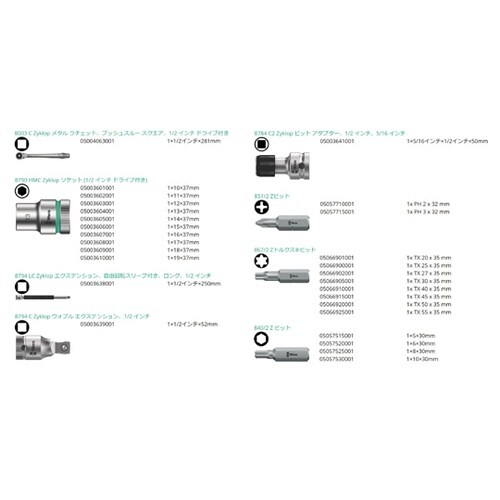 8100 SC 7 サイクロップメタルラチェット1/2” 押込み型スイッチ式セット。[ラチェット]非常にスリムなラチェットと長いレバー。戻り角わずか4.7°。 |
