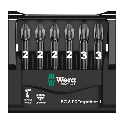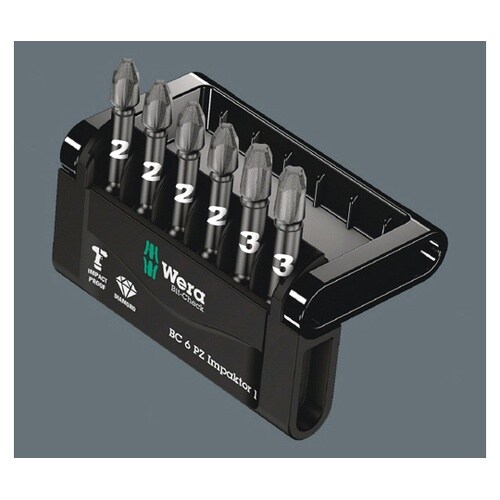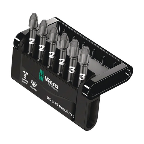 ビットチェック 6 PZ インパクター 1 ポジビットセット。6 個の Wera Impaktor ビットが最小限のスペースに整然と配置された実用的なビットチェック。 |