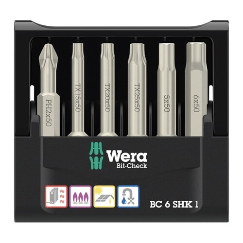 ビットチェック 6 SHK 1 SB。Wera(ヴェラ)ビット6本(長さ50mm)を実用的なビットチェックのわずかなスペースに綺麗に収納されています。配管、暖房、空調に適しています。 |