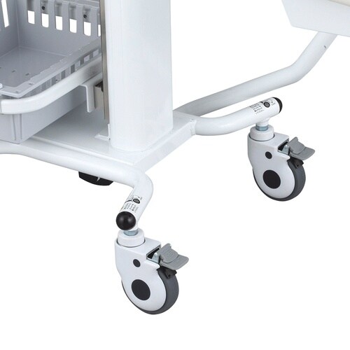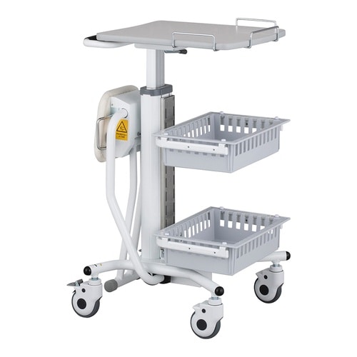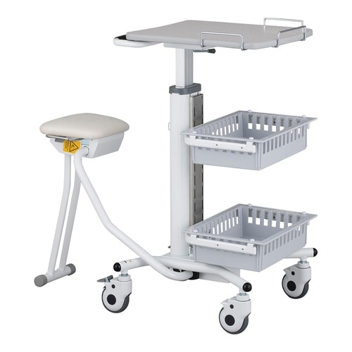 場所を選ばず着座で業務ができる。病棟など移動先でも座って業務ができます。天板は約430×520mmと面積が大きく、ノートPCを置いても十分な作業スペースがあります。 |