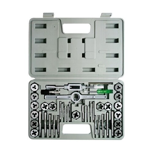 切れ味の鋭い特殊溝刃を使用した全てが揃った。あらゆる作業に対応出来る豊富な17サイズのタップ。ダイスとタップハンドル。ダイスハンドルのほかにピッチゲージもセット。タップ。 |