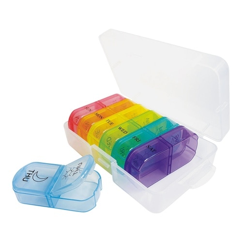 1週間7色、1日2回分のパステルカラーを用いたピルケース。朝・晩の1日2回分仕様で飲み忘れ防止に。1日単位で持ち運びも可能。色で識別管理が可能。 |