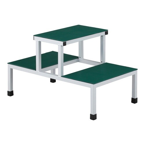 運動負荷試験のマスター2階段法に適した階段です。踏み板の表面に滑りにくいストップレザーを貼っているため、安全に使用可能です。スチール製のため、木製に比べて強度に勝り、劣化が少ないです。 |
