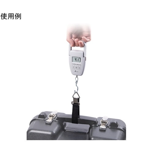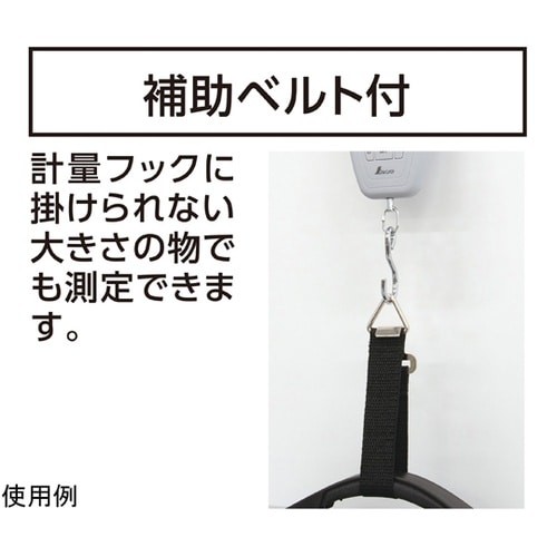 計量フックに掛けられない大きさの物でも測定できる補助ベルト付です。風袋引機能付で容器などの重さを引いた測定ができます。ホールド機能付です。オートパワーオフ機能付です。バックライト機能付です。 |