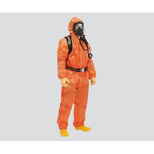 ファスナー部を防護するフラップ付きです。フード、袖口・胴回り・足首部分はゴム紐入りです。伸縮性のある内袖口です。アンモニア・フッ酸・ジエチルアミンに強いです。 |