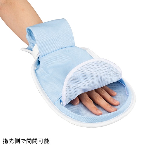 ストレスの少ないミトン。患者にストレスを感じさせにくく、誤って取り外されにくい手首は締め具合を調整しやすい面ファスナーで固定し、患者が誤って外さないようにバックルベルトとカバーで保護します。 |