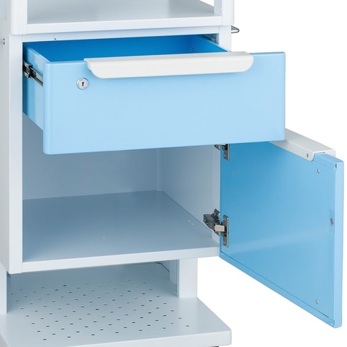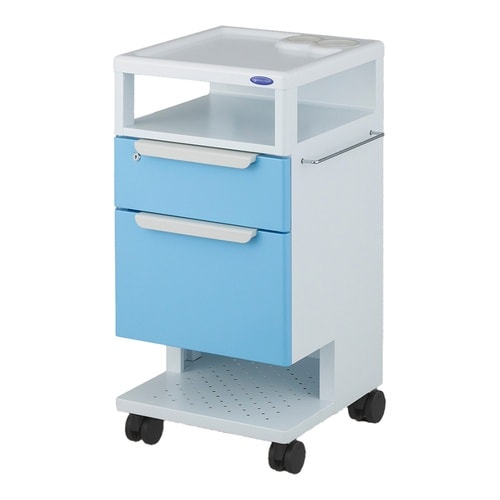 天板にカップホルダー、下段に靴収納スペース、両側面にタオル掛けを備えています。上段の引出しは鍵付きです。背板部分にはケーブルホールがあるため、配線などをすっきり収納できます。 |
