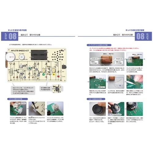 専用ボードに部品をはんだ付けし、6石AMラジオを組み立てます。CDにフルカラー解説書を収録。組み立て方法だけでなく、「抵抗値と静電容量の読み方」「はんだ付け例」「回路図」等のコンテンツを含んでいます。 |
