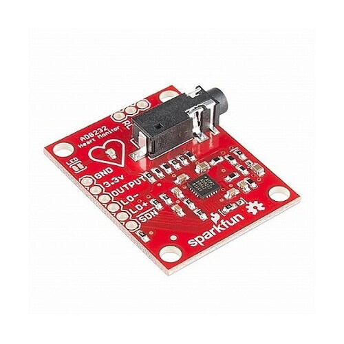 単極誘導心電モニタIC(AD8232)を用いた心電計基板です。3つの電極を右腕・左腕・右脚にとりつけて心電を測定します。電極は付属していませんので、別途ご用意していただく必要があります。 |