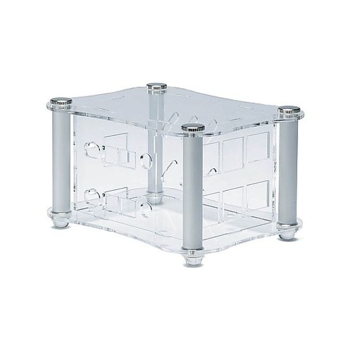 コーナーにアルミ円柱を使用した高級感のあるデザインのアクリル製スケルトンケースです。Raspberry Pi 4 Model Bの基板が2層収納出来ます。 |