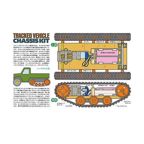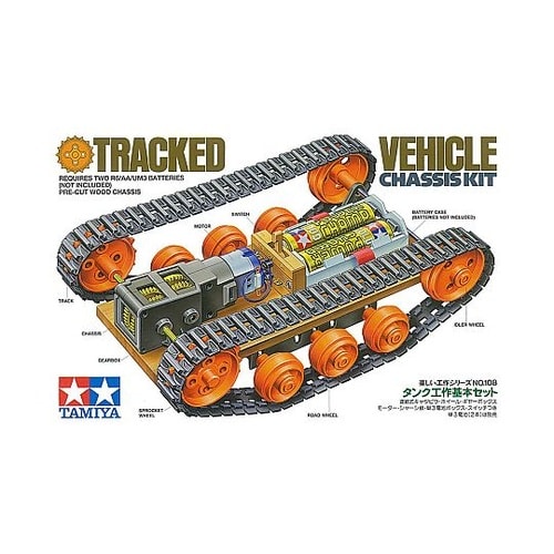 走破性に優れたキャタピラで動く車の組み立て工作キットです。ギヤボックス、逆転スイッチ付き単3電池ボックス、キャタピラとホイール、そして木製のシャーシなどをセットしました。 |