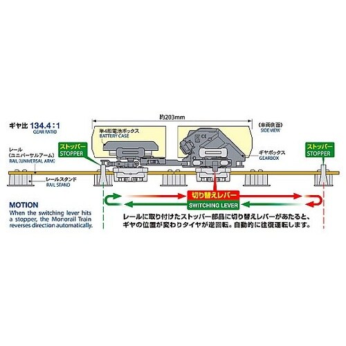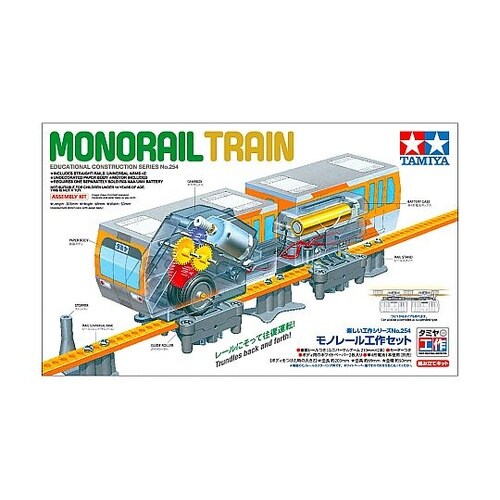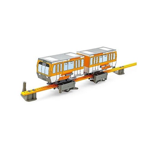 レールに沿って往復するモノレールの工作セットギヤボックスを乗せた車両と電池ボックスをのせた車両の2両編成で、レールに沿って往復運転をするモノレールの工作セットです。 |