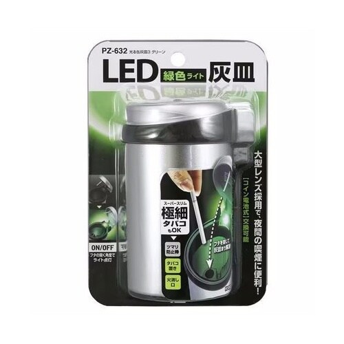 夜間の喫煙に便利なLED照明付きの灰皿。たばこ置きや、差し込むだけで消化できる1アクション火消し口付き(スーパースリムタバコにも対応)です。