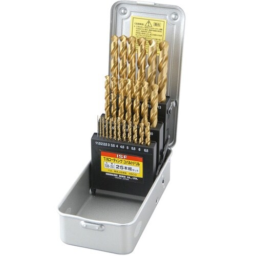 コバルトドリルにTiNコーティング(超硬質被膜処理)を施しており表面の摩擦抵抗が小さく、耐熱に優れ磨耗、焼付を軽減し約3ー10倍の耐久性があります。 |