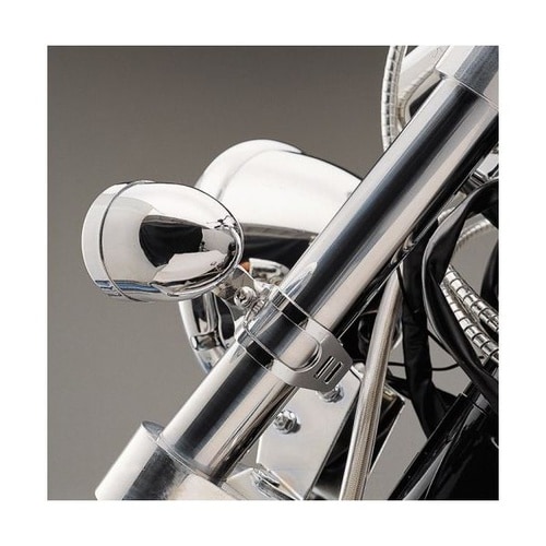 ステー等を介さずにシンプルな取り回しができるフォーククランプタイプのウインカー取付バンド。ウインカー取付穴径10mm。 |