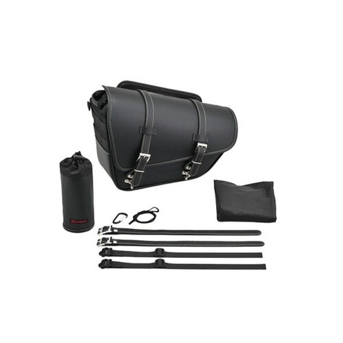 バイク用サドルバッグ左側専用。商品構成:レインカバー、ドリンクホルダー、合皮固定ベルト×2、ナイロン固定ベルト×2、緩み止めアジャスター×2、ひも×1、カラビナ×1 |