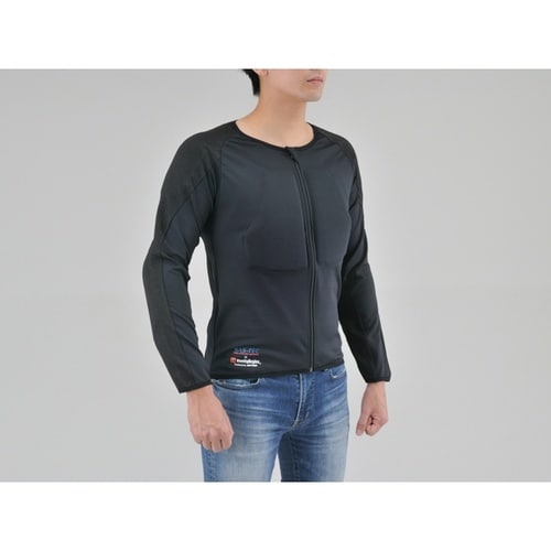衝撃時に瞬間硬化するSAS−TEC製プロテクターを胸部・ひじ・肩・背中に装備したインナープロテクター。摩耗に強い特殊生地「HPPEマテリアル」を腕と背中にその他の部位にはストレッチ生地を採用 |