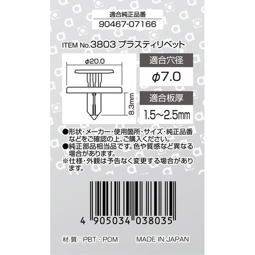 3803 プラスティリベット (トヨタ車用) タイヤハウス・リアバンパーアンダー用/5個入り ※2個以上から注文可能(販売価格は1個単位の価格)