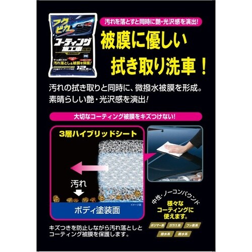汚れを拭き取りつつコーティング本来の艶・光沢感に仕上げるセミウェットタイプです。拭きスジが残らず汚れをシート内部に取り込み、キズの心配もなく中性・ノーコンパウンドで安心して使用できます。 |