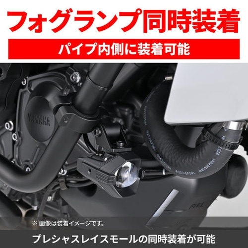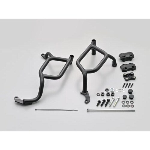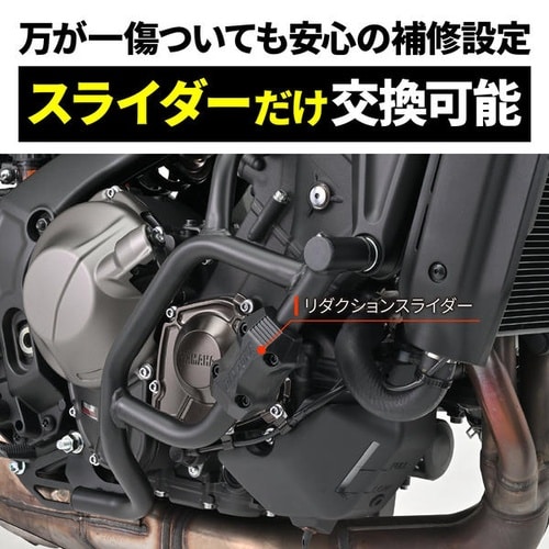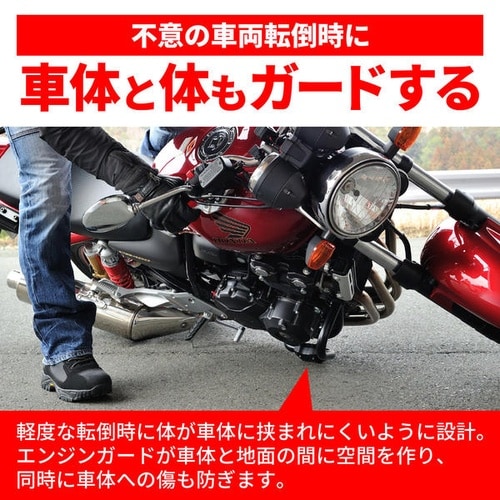 転倒時に車体とエンジンガードが接地し、身体が挟まれにくい設計です。軽度な転倒時にエンジンを保護し、ナイロンリダクションスライダーで衝撃を分散。Φ25.4メインパイプでアクセサリーが装着可能です。 |