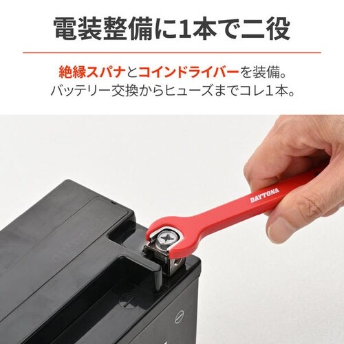 バッテリー端子等の電装整備に便利な絶縁スパナです。表面の樹脂コーティングが火花・ショートを防ぎ、反対側は電装カバーやヒューズボックス開閉用のコインドライバーとして使用できます。 |