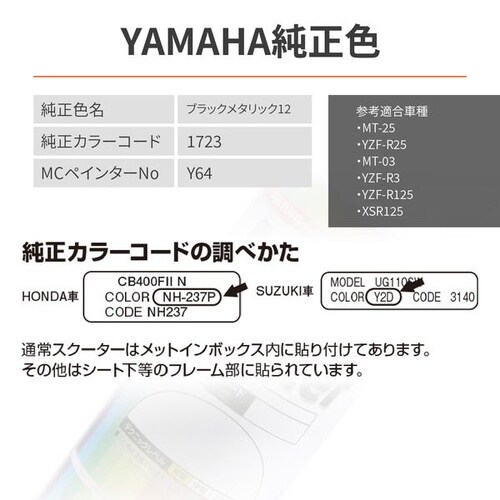 | 注意事項 | ※色を選ぶ前に必ずバイクの純正カラーコードをご確認ください。(ツートンカラーの場合は注意が必要です)(同メーカーであっても類似色がありますので、正確にカラーコードをお調べください) |