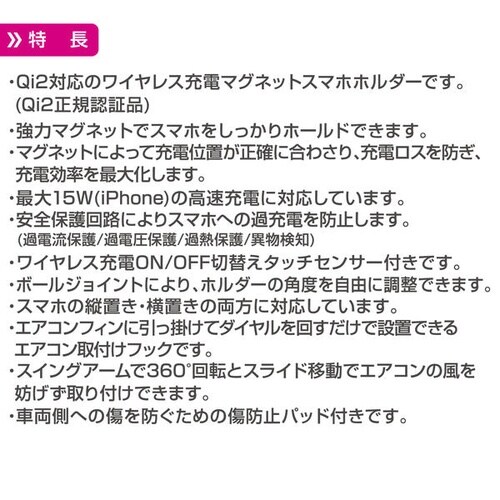 Qi2対応のマグネット式ワイヤレス充電ホルダーです。最大15W充電対応で安全保護機能を搭載。エアコン取付けで角度調整も自在です。 |