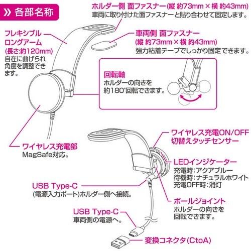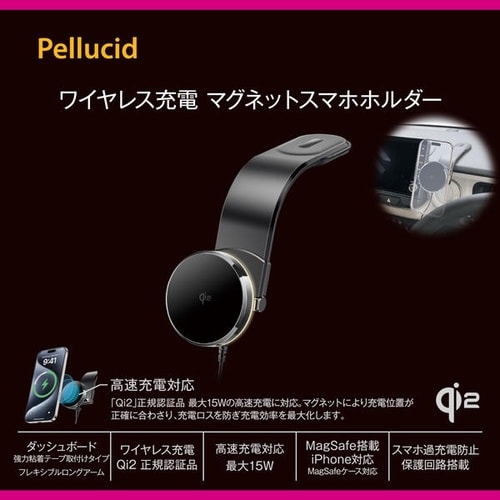 Qi2対応のマグネット式ワイヤレス充電ホルダーです。最大15W充電対応で安全保護機能を搭載。ロングアームで自在に設置可能です。 |