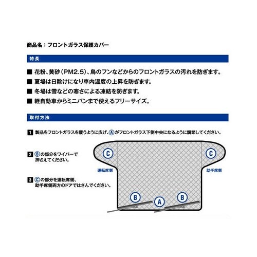 ドアにはさむだけで簡単に装着できるフロントガラスカバーです。花粉や雪を防ぎ、夏は日除け、冬は凍結防止に役立ちます。 |