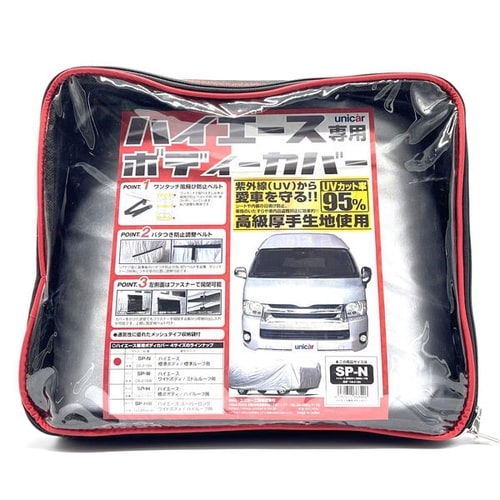 200系ハイエース対応のボディカバーです。厚手ポリエステルオックス生地でUV95%カット。風飛び防止ベルトと開閉ファスナー付きです。 |