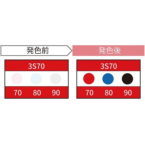発色温度:70・80・90℃ | 発色色調:白→赤・青・黒 | 耐熱温度:160℃以下 | 保管環境条件:直射日光を避け、設定温度より−20℃程度の冷…