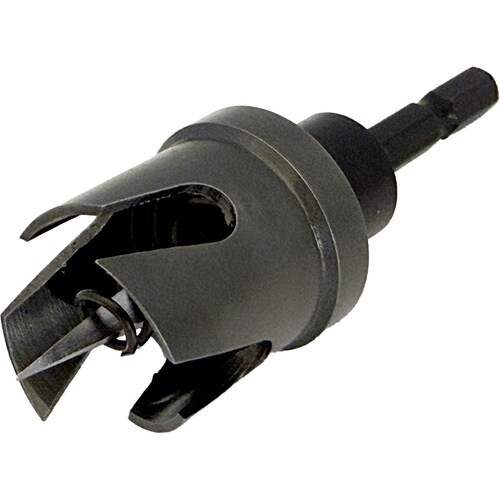 プルボックス(樹脂)の穴あけ作業に最適。塩ビパイプを綺麗に貫通可能。ビニル板貫通の瞬間、切片が落下。コンパネなど木材へも用途拡大。使いやすい六角軸を採用