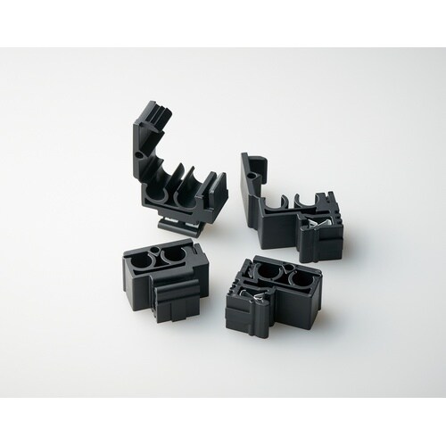 ソーラーパネルや架台フレームのエッジにはめ込み、ケーブルを挟むだけで簡単に配線施工できる、作業性抜群の配線固定。 |