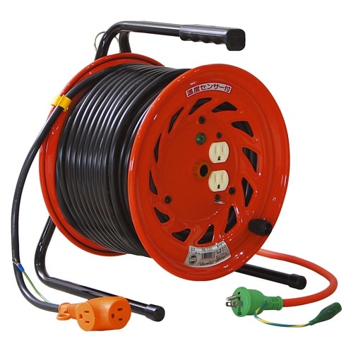 屋内型の電工ドラム50m(1次線3m+2次線47m)です。コード先端がコンセントになっている、コンセントを引き出して使用する逆配電・延長コードタイプです。 |