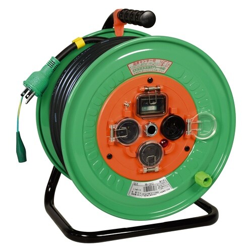 屋外型の電工ドラム50mです。ブレーカータイプは漏電保護専用、温度センサー搭載(自動復帰タイプ)です。入力プラグはポッキンプラグです |