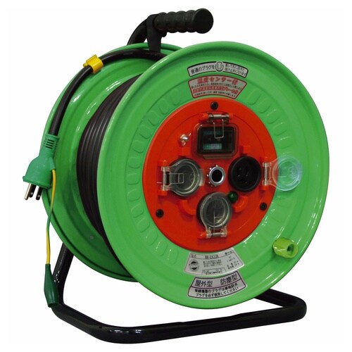 屋外型の電工ドラム30mです。ブレーカータイプは漏電保護専用、温度センサー搭載(自動復帰タイプ)です。入力プラグはポッキンプラグです |