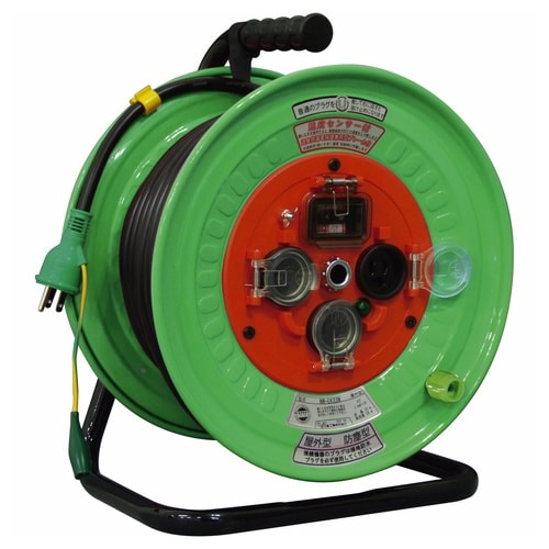 屋外型の電工ドラム30mです。ブレーカータイプは過負荷漏電保護兼用、温度センサー搭載(自動復帰タイプ)です。入力プラグはポッキンプラグです |