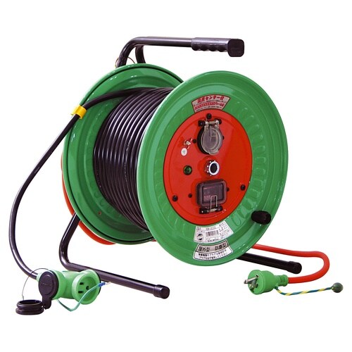 屋外型の電工ドラム50m(1次線3m+2次線47m)です。コード先端がコンセントになっている、コンセントを引き出して使用する逆配電・延長コードタイプです。 |